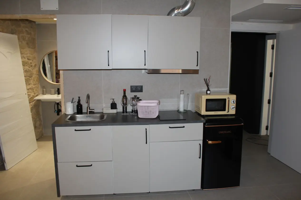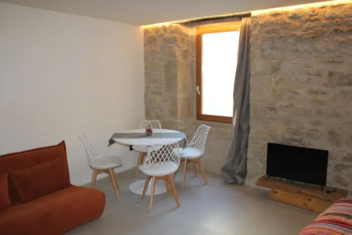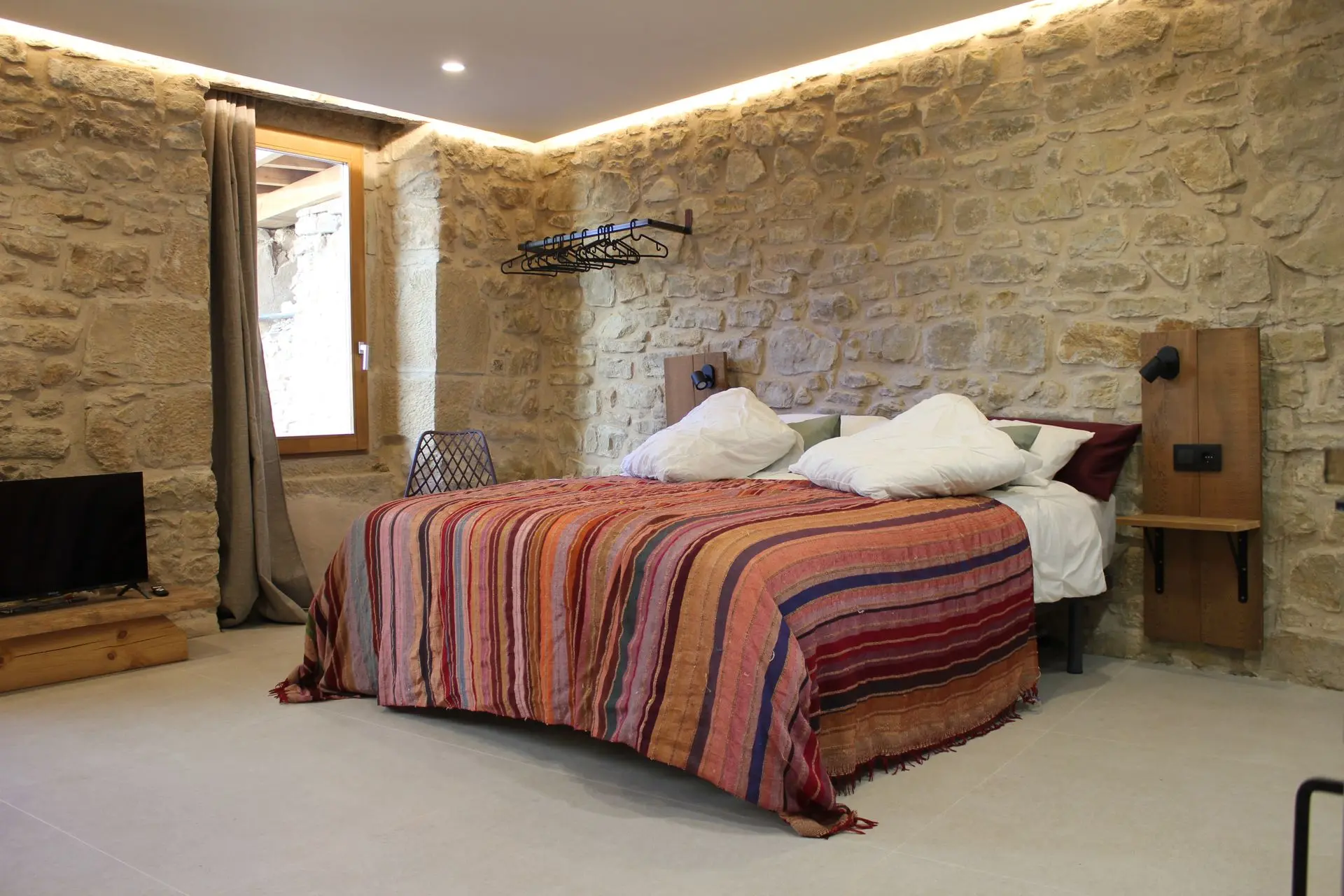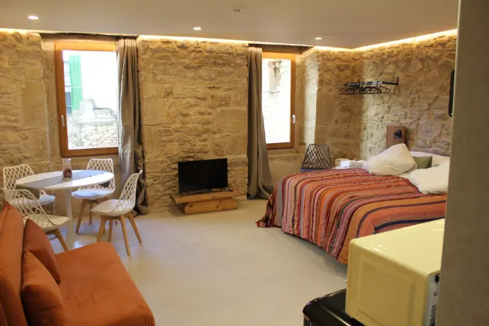 Con muros de mampostería centenaria y una decoración minimalista que respeta la esencia del lugar, Matarredo es ideal para quienes valoran el carácter y la simplicidad bien pensada. Este apartamento tipo estudio ofrece un espacio diáfano adaptado para personas con movilidad reducida, con una gran cama doble, zona de comedor, sofá cama y cocina equipada. La piedra vista y la luz tenue crean una atmósfera serena, perfecta para descansar tras un día de visitas o de ruta entre viñedos.
