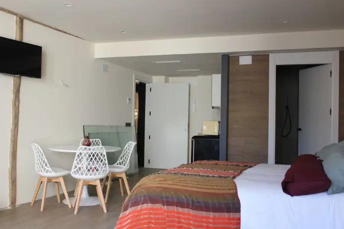 Este apartamento tipo estudio ofrece un espacio amplio y acogedor, con cama doble kingsize, sofá cama, comedor para cuatro personas, cocina equipada y un gran baño.